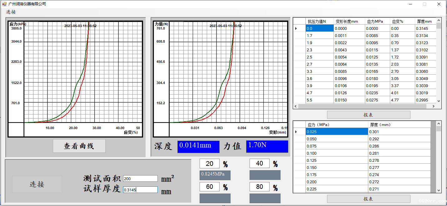 将样品装在两块光滑的平板夹具之间。测试过程中,在两块夹具的外侧施加压强,记录整个施压过程和卸压过程中的样品的厚度和压强的变化值,测试结果可生成excel报表和曲线。